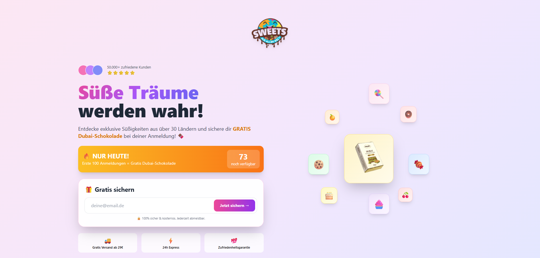 Dubai Chocolate presents a simple registration portal aimed at welcoming the first 100 customers. It allows visitors to submit their information to secure early access to exclusive offers or premium products.